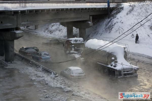В Екатеринбурге, на улице Шефской под мостом по ул. Блюхера, прорвало 600-мм трубу, что и вызвало заторы на дорогах. Около сотни метров дорожного полотна скрылись под полуметровой толщей воды, около десятка машин заглохли и не смогли выбраться из воды самостоятельно. В то же время 200-мм труба лопнула в центре города, в районе перекрестка Малышева - пер. Банковский. Вода залила улицы и ушла под уклон - на Радищева. В результате дольше всего оказался закрытым участок улицы Радищева между ул. 8-марта и Добролюбова - как раз по дороге к резиденции Полпреда Президента в УрФО. Тут машины не тонули, но лишняя пробка в центральной части города в утренний час пик - беда для сотен и тысяч людей. Смотрим фотографии с обоих мест ЧП.