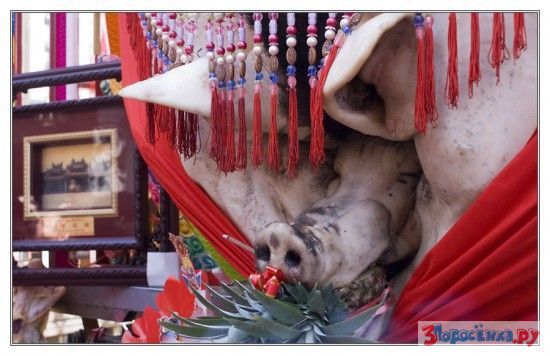 К фестивалю Священной свиньи в Тайване готовятся несколько лет. Фермеры откармливают хрюшек на убой, они достигают нереальных размеров, это вы можете наблюдать на фотографиях. Потом свиней убивают и выставляют на обозрение, не подумайте, это не куклы - реальные свиньи.