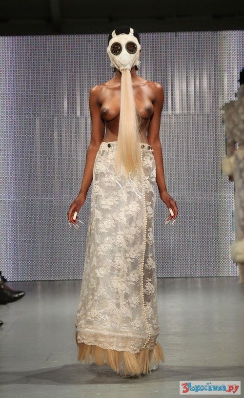 На большинстве манекенщиц кроме париков от Ле Минду не было больше никакой одежды. Многие были залиты краской имитирующей кровь.