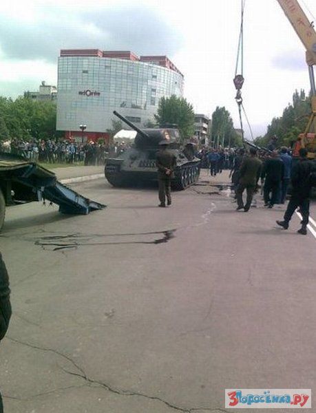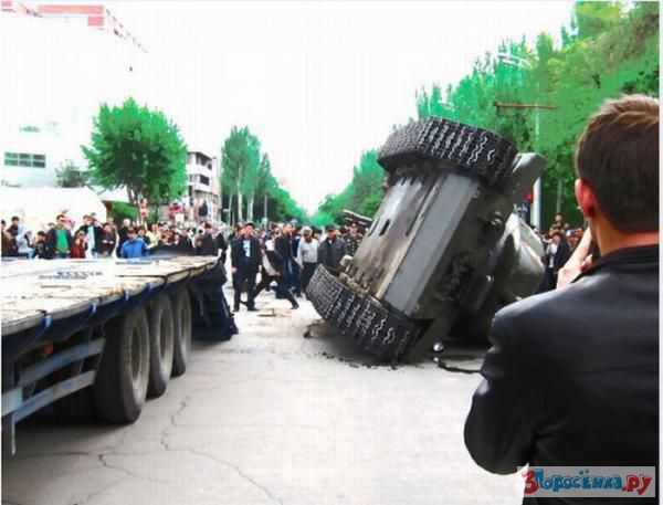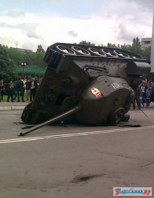 Танк грузили на портал, что-то пошло не так и произошло опрокидывание.