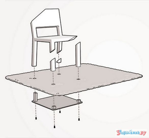 Все очень просто: единственная целая ножка стула прикреплена к широкой пластине, которая спрятана под ковром. Поэтому-то стул и не падает, что на первый взгляд очень удивляет непосвященного зрителя :)