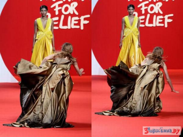 Юная модель Линдсей Виксон упала три раза во время показа мод, который организовала топ-модель Наоми Кэмпбелл. 17-летняя девушка была одета в золотистое шелковое платье и туфли на высокой платформе. Поворачивая за кулисы, Линдсей упала, поднялась и помахала зрителям, которые поддержали ее аплодисментами. Однако после этого она еще дважды упала на колени и аудитория перешла от оваций к смеху.