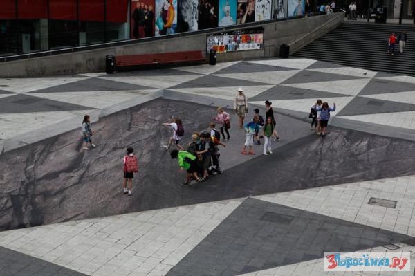 Огромная оптическая иллюзия 32 на 18 метров находится в Стокгольме. Сделал её Эрик Йохансон. Получилось очень здорово