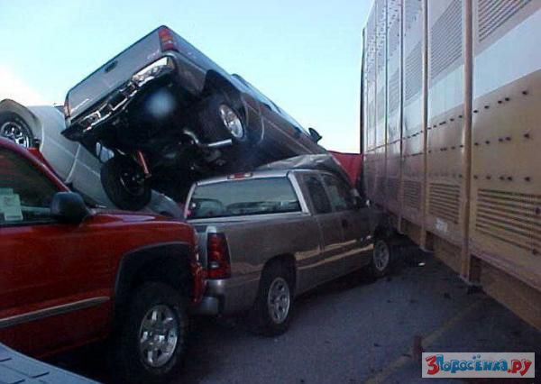 Авария произошла на ж/д перегоне Oshawa CP Rail, Канада, на линии разгрузки автомобилей GM. Сотрудник случайно отцепил три вагона, не имеющих аварийных тормозов. Площадка разгрузки была под наклоном и вагоны начали движение, пройдя 150 метров и набрав приличную скорость, произошло схождение с рельсов. Пикапы вывалились на припаркованные ранее новые автомобили. Пострадало около 300 авто. Что теперь будет с этим сотрудником, который совершил ошибку, не понятно.
