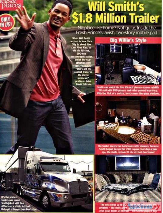 Гигантский трейлер, который Уилл Смит использовал, стреляя на Брум-Стрит в "Люди в Черном 3" имеет больше пространства, чем две спальни, две городских ванны и может похвастаться удобствами, которых нет даже в городских квартирах высокого класса сопоставимого размера. Трейлер 15 метров длиной и весом 30 тонн был слишком большим для жителей области и нарушал их ежедневную рутину. Жалобы от жителей заставили мэра Нью-Йорка Майкла Блумберга действовать. Он приказал убрать трейлер, что бы он не мешал движению. Производственная компания должна была подчиниться, и трейлер был перемещен на пустую автостоянку. Уилл Смит теперь выбрал намного меньший 7-метровый трейлер. Смит только хмурился когда его спрашивают о компромиссе, который он должен был сделать. Трейлер высшего качества сделан Anderson Mobile Estates. Уилл Смит потратил $1,8 миллиона.