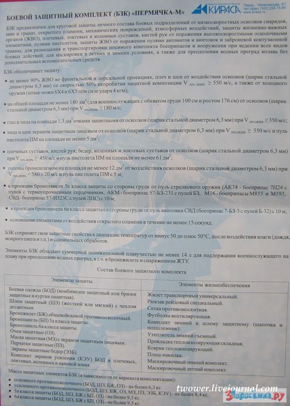 На МАКС-2011 ЦНИИ "Точмаш" продемонстрировало боевой защитный комплект с элементами экипировки от "Кирасы", "Техинкома", "Армокома" и иных производителей. Один из вариантов комплектации может выглядеть так:
