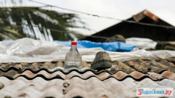 Конструкция вызывающе проста. В куске жести проделывается отверстие по диаметру бутылки. В нём пластиковая ёмкость надёжно фиксируется замазкой, а затем наполняется водой с добавлением капли отбеливателя (чтобы вода не мутнела от всякой заразы).