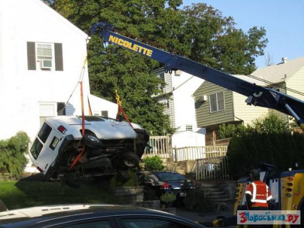 В одном из дворов на тихой улочке все переполошились после шума, который натворил этот белый фургон. Водитель не справился с управление и влетел сначала в дом, разбив тому угол, снес несколько деревьев и упал на машину, припаркованную возле гаража.