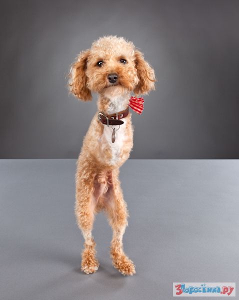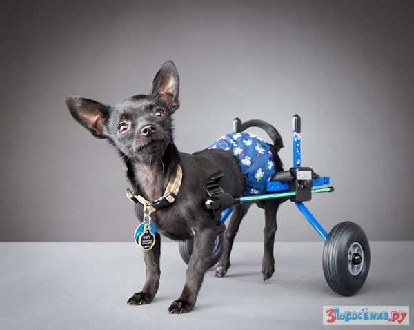 5. Нудли - пудель, который обе передние лапы потерял после несчастного случая. Для прогулок на улице у него приспособлена колясочка, но сам Нудли чаще любит гулять без нее.