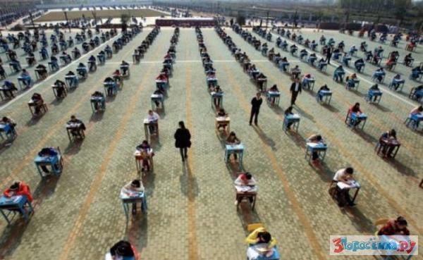 В средней школе китайского городе Вухан, списывание стало настолько повальным, что теперь все ученики вынуждены писать контрольные на улице. В большинстве западных стран уже давно кричали бы про нарушение прав детей, но это же Китай. Оказалось, что все методы борьбы со списыванием не помогли, и поэтому учителям пришлось пойти на эту меру. Теперь между партами достаточно большое расстояние, не позволяющее ученикам списать что-либо у соседа, между рядами ходят учителя, а также за учениками наблюдают преподаватели с возвышенностей, чтобы замечать любую подозрительную активность.