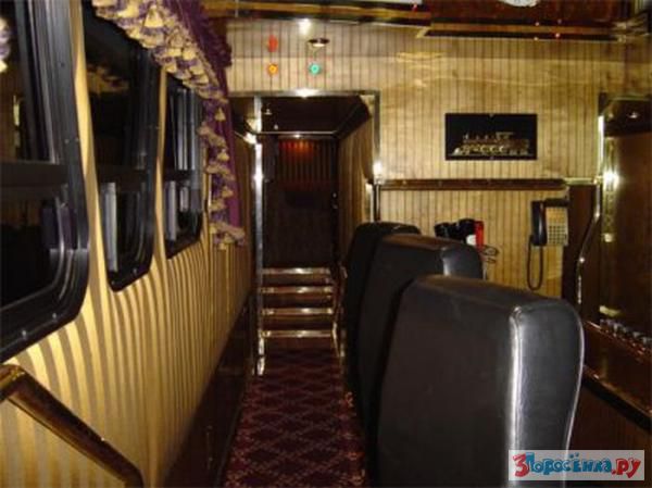 Внутренний интерьер Midnight Rider выполнен в стиле вагона президентского поезда 1870-х годов и сделан в основном из полированного дерева и стекла. В трех залах Midnight Rider, в каждом из которых есть свой бар, телевизионный экран и телефон, могут с комфортом разместиться 40 человек. Аренда этого монстра обойдется в 1000 долларов в час, а обслуживает Midnight Rider экипаж из пяти человек - два водителя, хозяйка, инженер и бармен.