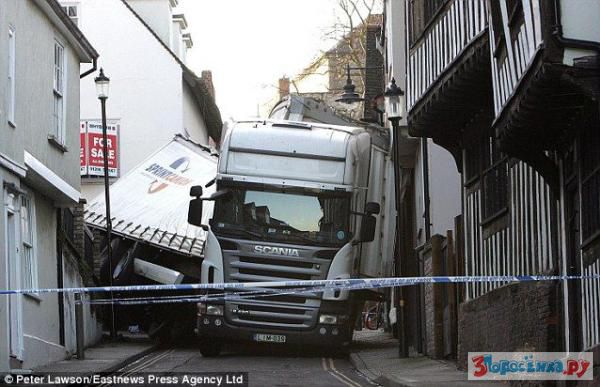 Венгерский водитель на 30-тонной фуре вез оливковое масло в Великобританию, его система навигации приказала водителю свернуть с трассы в переулок... Так как водитель не силен в английском языке и не знает английских знаков, то залез в очень узкий переулок, в котором застрял... Все его попытки выбраться были тщетны, мало того, при маневрировании грузовик повредил здание постройки 17-го века, плюс ко всему у него взорвалось колесо, которое еще больше усугубило состояние здания.