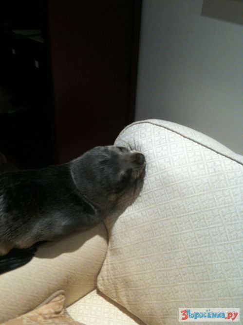 Все это время ластоногий малыш спокойно "общался" с многочисленными домашними любимцами Анетт, а затем, очевидно утомившись после долгой дороги, прополз в гостиную и уютно устроился на диване.