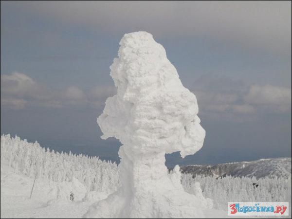 В зимних горных пейзажах северной части Японии есть удивительная особенность - деревья покрытые льдом и снегом. Их называют снежными монстрами.