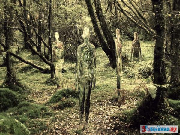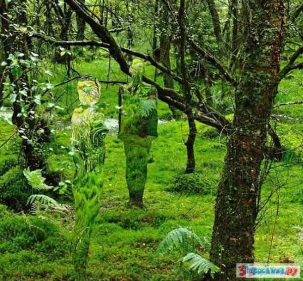 Мастер Роб Малхолланд создал свои статуи из оргстекла. Главный рабочий материал (полиметилметакрилат) способен искажать отражение света, благодаря чему проявляется эффект частичной невидимости. Произведения искусства художника уже установлены на тропе в лесу возле одного из местных озер. Во время работы над проектом лесного парка у скульптора возникла идея использовать редкий материал. Пытаясь создать лису, Малхолланд также старался передать ее неуловимость, которая была достигнута при помощи полиметилметакрилата. Страх то какой, представляете, если увидеть такое во время собирания грибов.
