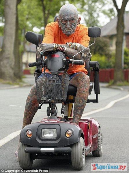 Прадедушка Томми Виллс (Tommy Wells) был признан самым татуированным человеком Великобритании. Каждый миллиметр его тела покрыт бессчетным количеством татуировок, которых на данный момент насчитывается чуть более 1000 ...