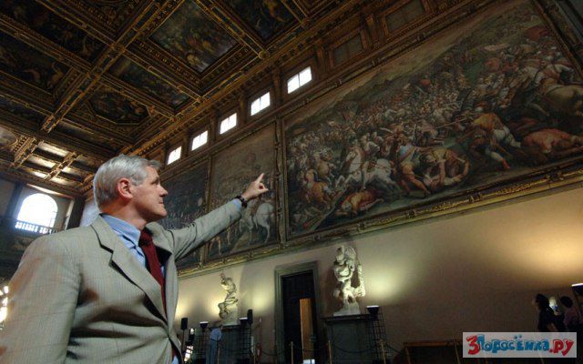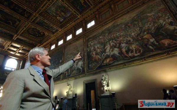 Искусствовед Маурицио Серачини изучает загадочную надпись на фреске Джорджо Вазари. На произведении Джорджо Вазари можно увидеть группу солдат, которые несут вымпел со словами "Cerca Trova" ("Ищите и обрящете"). Серачини уверен, что таким образом Вазари оставил знак о том, что именно скрывается под его фреской.