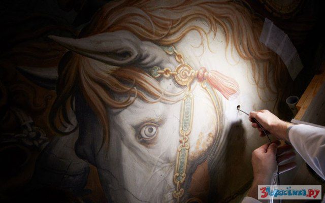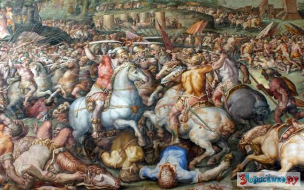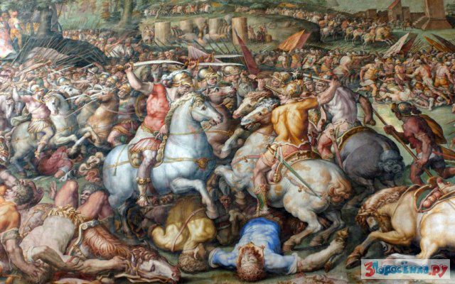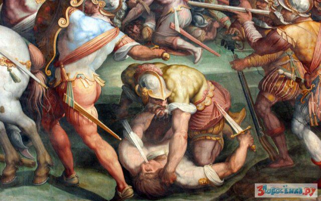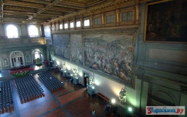 В 1503 году Леонардо да Винчи был нанят для создания картины "Битва при Ангьяри" флорентийскими правителями. Фреска должна была располагаться в так называемом "Зале пятисот" в Палаццо Веккьо во Флоренции. Современники называли эту работу Леонардо шедевром. Однако фреска загадочным образом исчезла, когда для дальнейшей работы по росписи "Зала пятисот" в Палаццо Веккьо был нанят еще один известный живописей Джорджо Вазари. Именно кисти Вазари принадлежат шесть фресок, ныне украшающих стены зала. Считалось долгое время, что фреска Леонардо да Винчи утрачена навсегда. На фотографии: батальная сцена фрески Джорджо Вазари, напоминающая своей композицией фреску Леонардо да Винчи "Битва при Ангьяри"