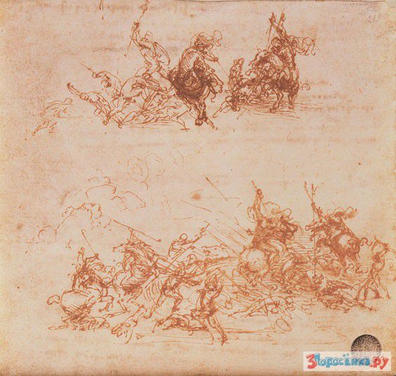 Набросок сделанный Леонардо да Винчи во время работы над созданием фрески "Битва при Ангьяри"(приблизительно 1504-1505 год, чернило)
