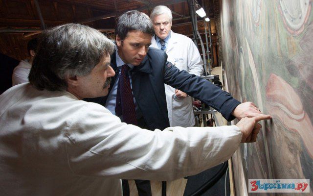 Предстоит проделать еще огромный пласт работы, но сделанное исследователями открытие, судя по всему, разрешило вопрос, терзавший специалистов более пятисот лет о местонахождении фрески Леонардо да Винчи. Похоже, мы становимся свидетелями колоссального события в истории искусства - одного из наиболее значимых событий за многие десятилетия. На фотографии: Реставратор фресок (слева на фотографии) обсуждает дальнейший план работ с мэром Флоренции Маттео Рензи ( на фотографии по центру) и искусствоведом Маурицио Серачини.