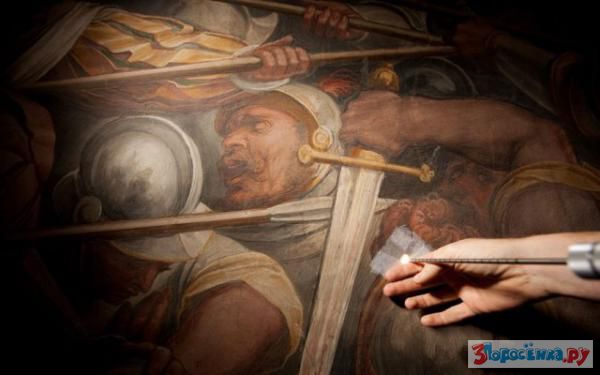 Исследователи обнаружили во флорентийском Палаццо Веккьо следы фрески, которая, скорее всего, принадлежит кисти легендарного создателя "Джоконды". Сейчас исследователи утверждают, что нашли первое веское доказательство того, что фреска, принадлежащая кисти самого Леонардо да Винчи, находится под батальной фреской, созданной в более поздний период Джорджо Вазари.