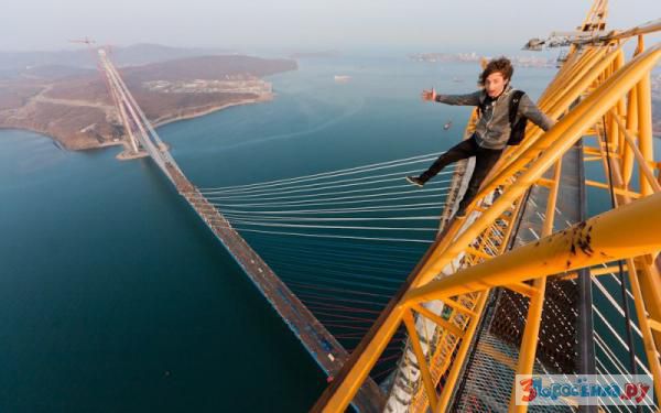 Трое любителей экстрима забрались без страховки на вершину трехсотметровых пилонов строящихся во Владивостоке мостов - на остров Русский и через бухту Золотой рог - и сфотографировали город с высоты птичьего полета.