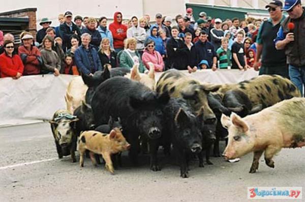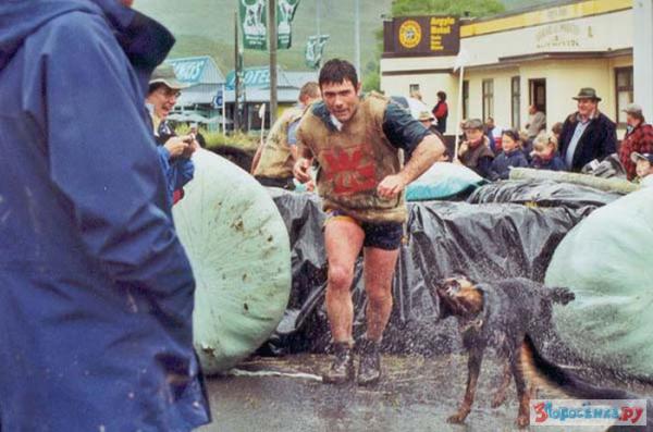 В Новой Зеландии проходит традиционный забег Hunterville Huntaway Festival с бычьими яйцами в зубах. Для конкурсантов придумано много интересных этапов, которые не всем под силу преодолеть.