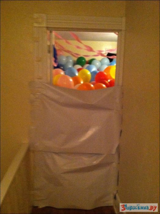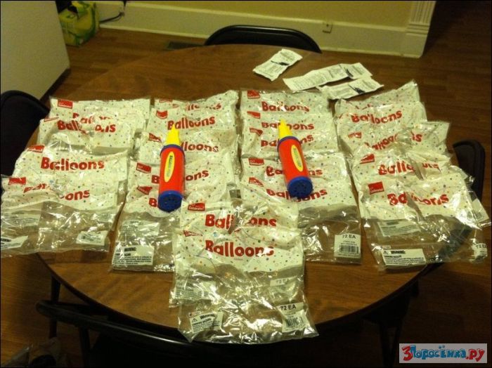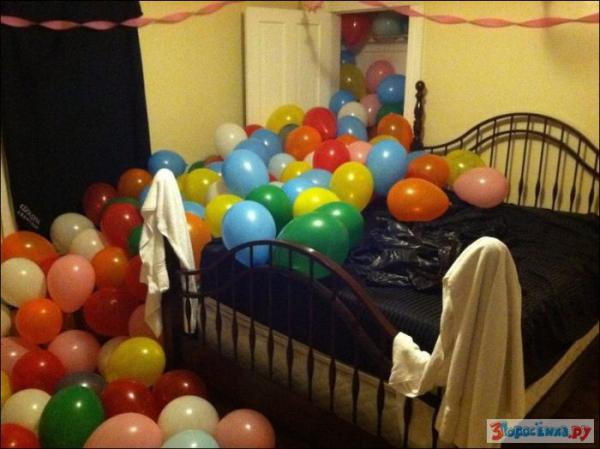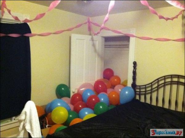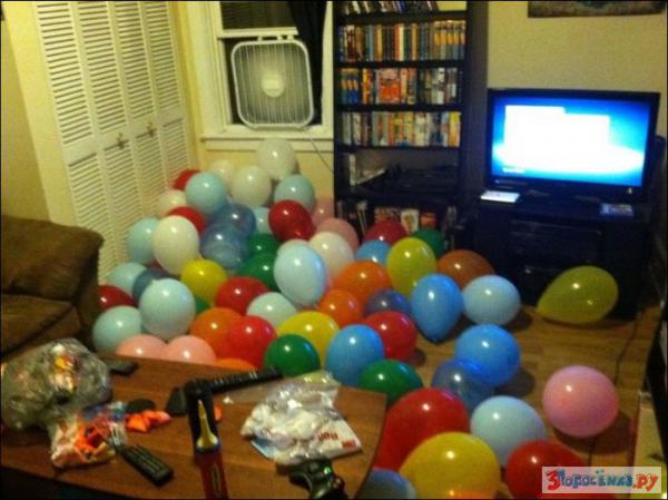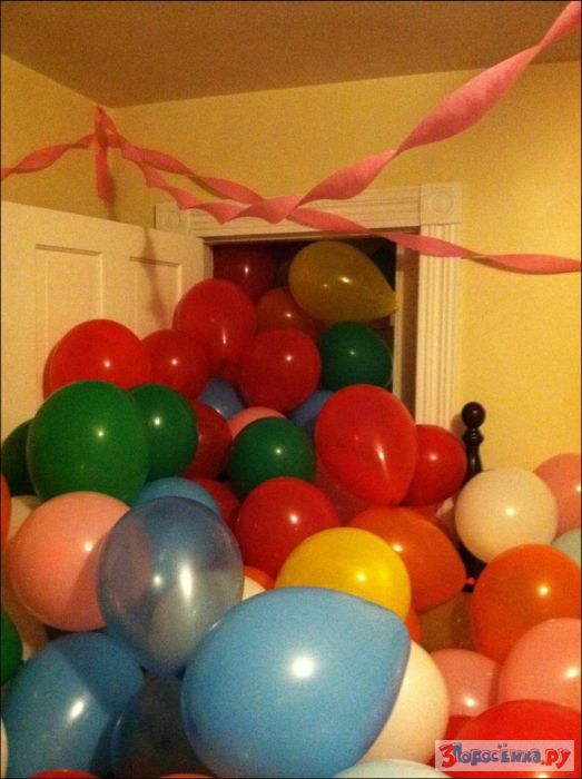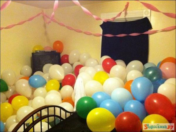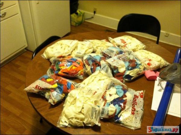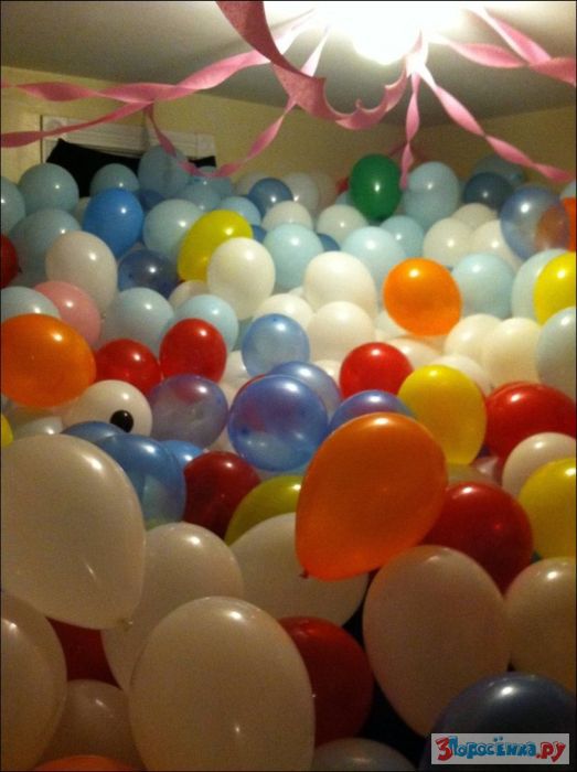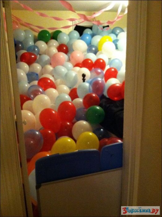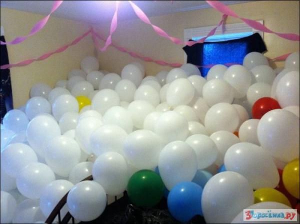 За два дня было надуто 1500 шариков и заполнена вся комната ими.