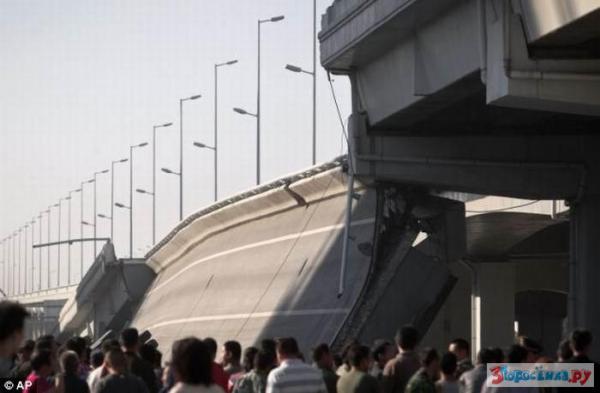 Это уже никуда не годится, ну ладно китайские телефоны ломаются и игрушки не качественные, но строительство автомагистрали должно строиться на совесть, тут не до шуток. Спустя 10 месяцев после строительства эстакады, ведущей на мост через реку, она обрушилась, срок службы вышел наверное. Погибли три человека, пятеро получили ранения.