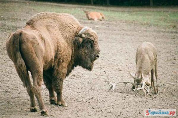 Смелый олень решил быкануть на зубра, а может и наоборот, суть не в этом.