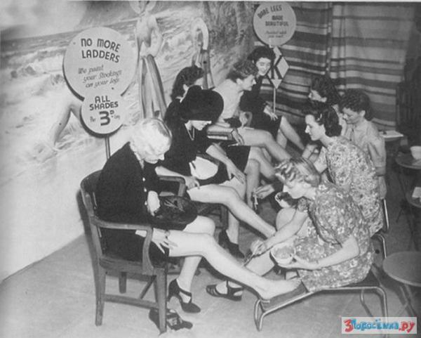 Во время Второй мировой войны американский концерн "Дю Понт", осчастлививший женщин в 1939 году изобретением нейлоновых чулок, свернул их производство в 1942 году, перейдя исключительно на выпуск военной продукции. Чулки стали непозволительной роскошью для большинства женщин - ведь на чёрном рынке цена пары чулок доходила до 20 долларов. В связи с этим женщины стали массово "рисовать" себе на ногах чулки, используя как домашние, так и патентованные средства. Кстати, с той же поры для американских женщин стало привычным бритье ног.