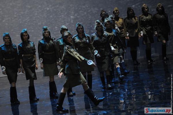 Девушки выходили на сцену в разных нарядах, в том числе и в сапогах и военной форме.
