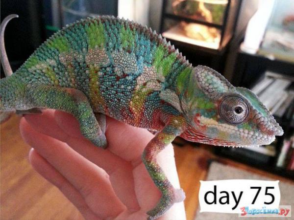 Познакомьтесь, это домашний хамелеон Йоши. Посмотрите, как он рос на протяжении трех месяцев и в какого красавца превратился.