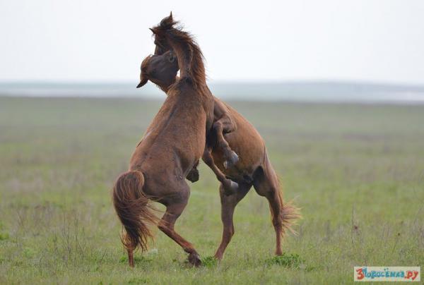 Всю жизнь держу лошадей. Сейчас в Брянском лесу меня дожидаются четверка обленившихся питомцев, которые только и думают, как не пропустить утреннюю кормежку овсом или как сломать гнилой забор у старухи-соседки и попасть на грядки. Жена им обрезает копыта, расчесывает гривы и хвосты, учит всяким трюкам. Но здесь, в Ростовском заповеднике, совсем другие по поведению лошади! И трюки у них еще те! Наблюдать за ними не менее интересно, чем за медведями на Камчатке, особенно сейчас, весной, когда кипят лошадиные любовные страсти. Это наиболее крупная и долгоживущая из известных на территории России популяция одичавших лошадей, к тому же живущая уже шестьдесят лет изолированно на острове, окруженном солеными водами озера Маныч-Гудило. Остров Водный - самый большой на Маныч-Гудило. Его длина до 12 км, ширина до 3,5 км. Здесь нет ни одного дерева или даже кустарника. Это всхолмленная степь. Остров образовался в 1953 году, когда после строительства Невинномыского канала изменился гидрологический режим Маныча. Поднятие уровня воды было неожиданным для животноводов, и они не успели перегнать скот на материк посуху. Овец перевезли на лодках, а несколько лошадей донской породы остались на острове зимовать. Весной их поймать не сумели - лошади почувствовали вкус свободы. Они и стали родоначальниками вольного табуна. До образования Ростовского заповедника численность лошадей была небольшой, колебалась в пределах нескольких десятков голов. Местный совхоз переправлял сюда на лето паромом овец, для которых сделали скважину с полупресной водой, которую пили и лошади. Периодические попытки отловов и отстрелов выработали у лошадей страх перед людьми и техникой. Лошади сумели приспособиться к самостоятельной жизни в условиях засушливой степи: круглый год использовать подножный корм, жить без укрытий. К началу девяностых люди перестали завозить на остров овец, скважины забились, и лошади оказались предоставленными сами себе. В 1995 году был образован Ростовский госзаповедник. Остров Водный оказался в его составе. Инспекторы заповедника прекратили браконьерский отстрел лошадей. В первые годы работы заповедника лошади настороженно относились к людям. В свой первый приезд в Ростовский заповедник в в конце девяностых я даже не сумел их сфотографировать. Табун не подпускал человека ближе чем на километр. Навстречу людям выбегал жеребец-вожак, который вел себя довольно агрессивно, идти на сближение с ним не хотелось. Сотрудники заповедника провели с материка на остров полукилометровую водоводную трубу и устроили водопойную площадку. Численность лошадей начала быстро увеличиваться. Если в 1995 году году на острове обитало 67 особей, то в в 2006 их количество превысило четыре сотни. Это оказалось на пределе кормовых ресурсов острова. Зимой 2009/10 гг более половины лошадей погибли. Часть животных, впервые в истории сумела, спасаясь от бескормицы, перейти Маныч-Гудило по льду и уйти в сопредельную Калмыкию. Оставшихся спасла организованная людьми подкормка. Теперь заповедник пытается поддерживать численность лошадей в пределах 100 - 150 особей путем отлова части лошадей-подростков. Сейчас здесь обитает 150 лошадей.