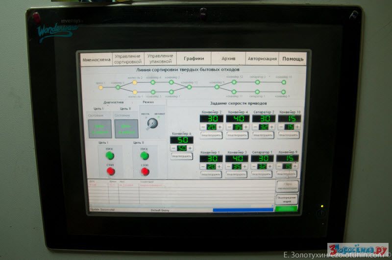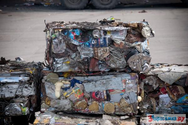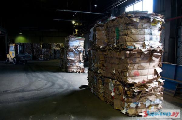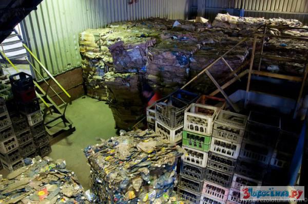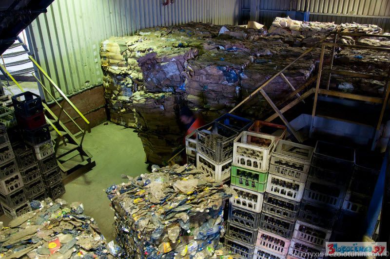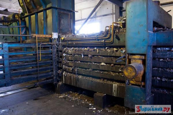 Отсортированный мусор заходит в пресс, где с силой в 180 тонн сжимается в 5-6 раз