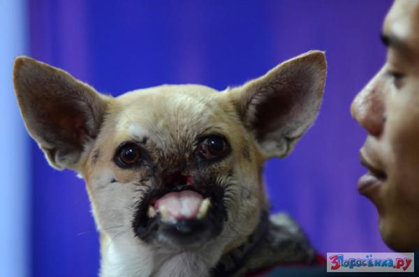 В филиппинском городе Замбоанга после длительного лечения вернулась собака по кличке Кабанг (Kabang), которая в результате аварии потеряла верхнюю челюсть. Животное проходило терапию в течение восьми месяцев в Калифорнии.
