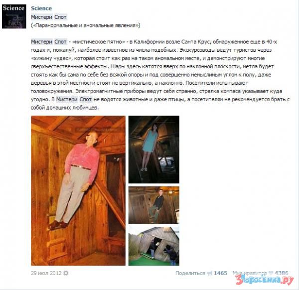 Природная аномалия глазами "Первого канала".Иcтория о "Mystery Spot" - природной аномалии в Калифорнии - впервые появилась в паблике "Знаете ли вы" и была успешно заимствована многими другими группами, в числе которых "Esquire" и "Science".