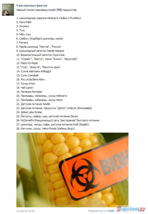 Черный список производителей ГМО-продуктов.Скандальный список продуктов, содержащих ГМО, который якобы опубликовал "Гринпис", побывал чуть ли не во всех группах и на стенах тысяч пользователей. В условиях массового помешательства на здоровом питании тема распространилась с устрашающей скоростью. В список, помимо всего прочего, попали как вполне ожидаемый McDonald's и сети быстрого питания, так и не вызывающие подозрения Danone и Nestle.