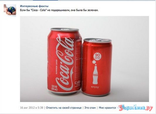 Зеленая Кока-Кола.Легенда о популярном напитке, облетевшая тысячи пользвователей, гласит о том, что если бы Coca-Cola не подкрашивали, она была бы зеленой.