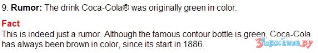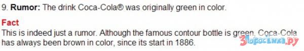 Опровержение: Исходя из состава Coca Cola, в который входят: вода, углекислый газ, сахар, краситель (карамель E150d), фосфорная кислота, ароматизаторы (в том числе кофеин), никаких причин напитку быть зеленым нет. Если убрать краситель то Coca Cola будет выглядеть как прозрачная вода.