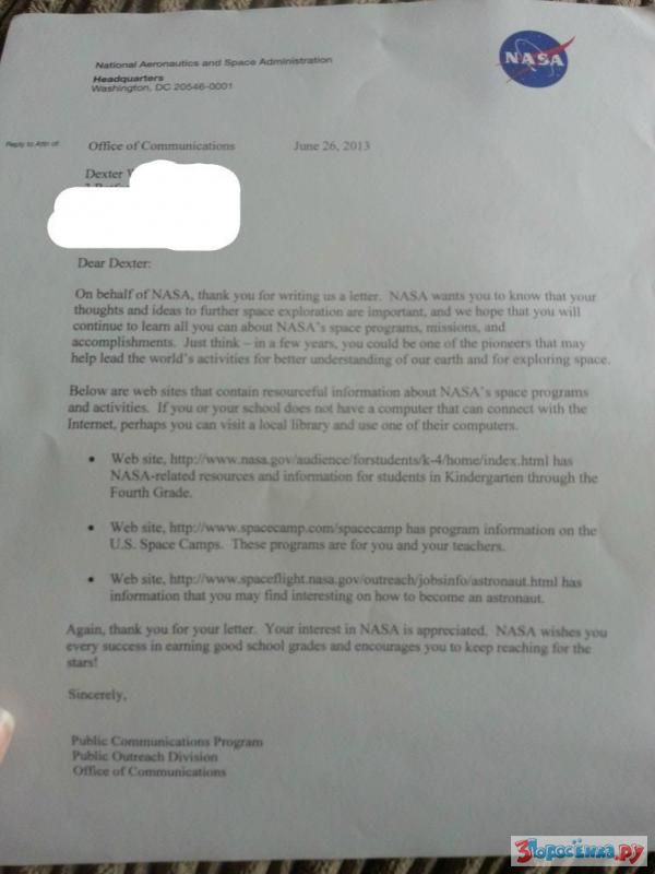 NASA ответило 7-летнему мальчику: Дорогой Декстер. Спасибо за письмо. Мы очень хотим, чтобы ты знал -твои мечты о космосе крайне важны для нас, и мы надеемся, что ты продолжишь интересоваться нашими космическими программами, миссиями и достижениями. Только подумай -всего лишь несколько лет и ты сможешь стать одним из тех людей, которые помогают человечеству лучше понимать Землю и космос. Ниже расположены сайта, где находится информация о деятельности NASA. Если в твоей школе нет соединения с интернетом, то ты, возможно, попробуешь воспользоваться компьютером в местной библиотеке. И снова -спасибо за письмо. Мы оценили твой интерес к нам. Желаем успехов в учебе и поддерживаем стремление к звездам!