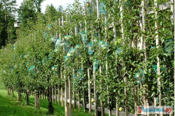 На плодовое дерево груши, надеваются пустые бутылки, на каждую завязь плода по бутылке, и привязываются эти бутылки, разумеется, к веткам.