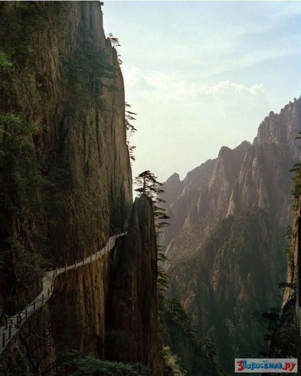 Горный хребет Хуаншань, расположенный в массиве китайских Жёлтых гор, пересекает пешеходная дорога, один из участков которой проходит по мосту, называемом местными "Мост бессмертных". Если вы когда-либо хотели проверить своё бесстрашие, то данное место точно для вас. Мост со столь грозным названием сжимают собой два массивных гранитных пика, однако главное испытание представляет тропа, состоящая лишь из хлипких досок и цепей, за которые необходимо держаться, чтобы не рухнуть в пропасть.