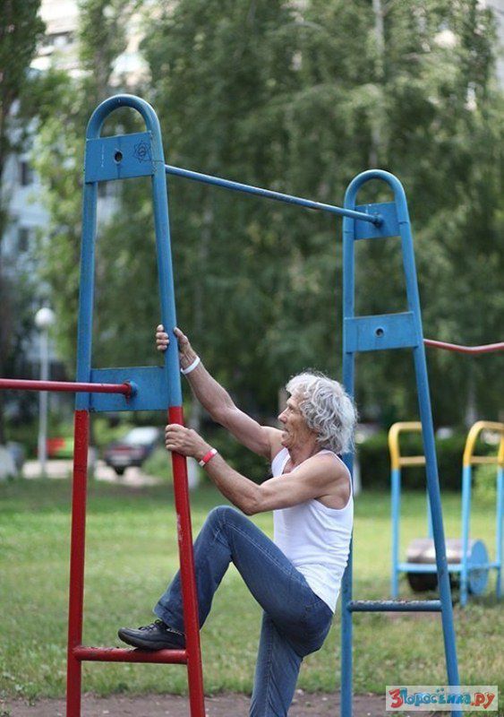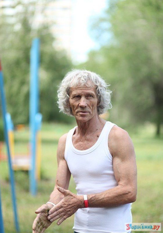 Его зовут Вячеслав. Для всех он уже давно стал Дядей Славой или Дедом, который крутит "солнышко". Жилистый седовласый он до сих пор в форме и делает по 6-9 оборотов "солнышка" на турнике как раз-два.