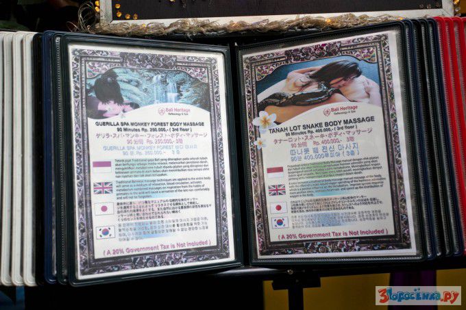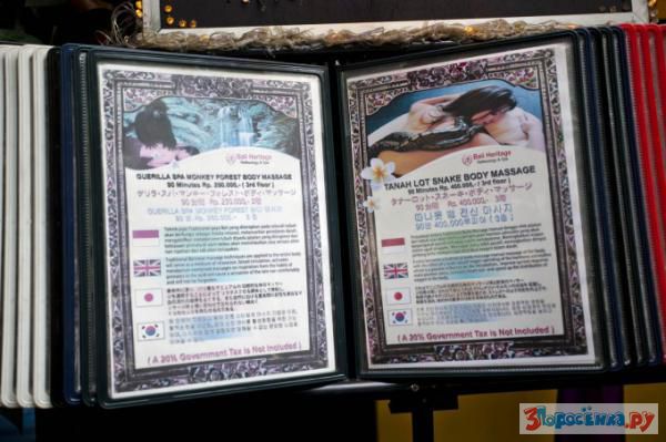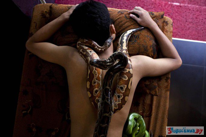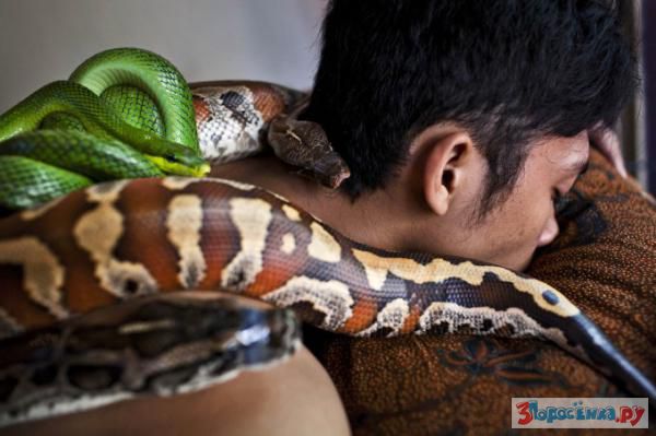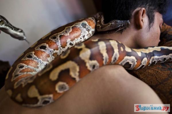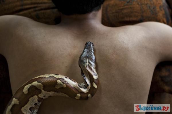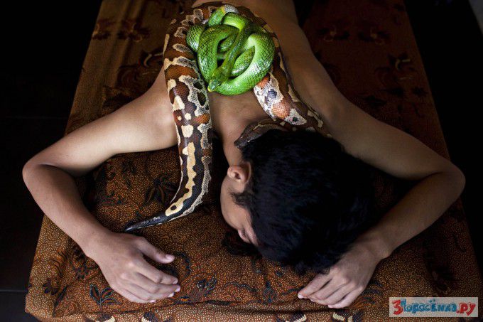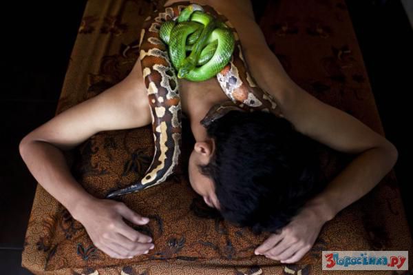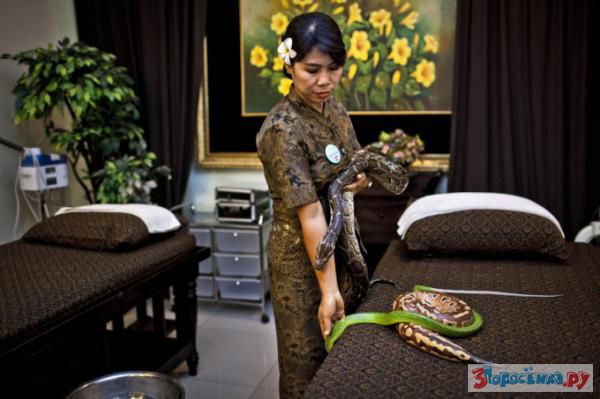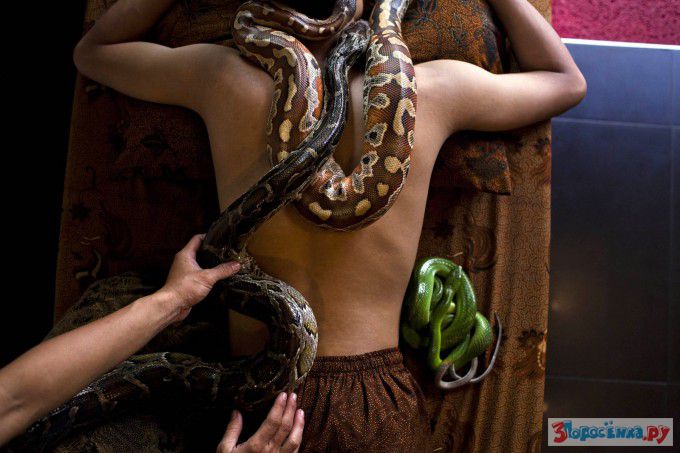 Клин клином вышибают. В индонезийском спа-центре посетителям помогают избавиться от стресса с помощью...гигантских питонов! Центр рефлексотерапии "Bali Heritage Reflexology and Spa", открытый в Джакарте, предлагает своим клиентам змеиный массаж: на спину клиенту кладут огромных питонов, после чего посетитель тут же забывает о своих повседневных заботах и проблемах.