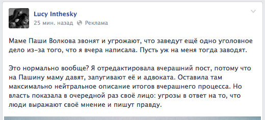 Скрин фейсбука девушки Паши, которая была вчера на заседании суда.