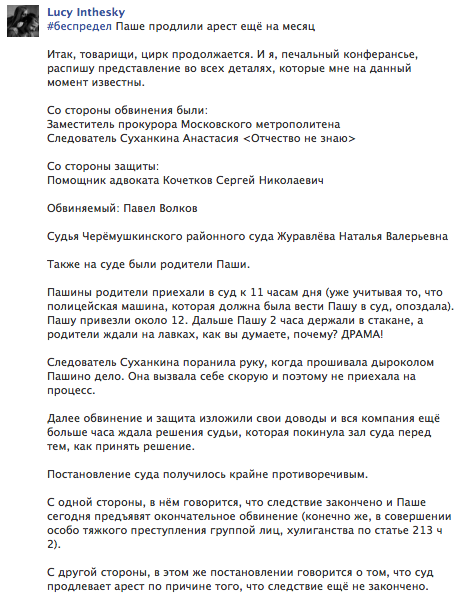 Вчера состоялось очередное заседание суда, на котором обоим участникам продлили арест еще на месяц, при том, что следствие уже официально закончено. Само заседание отложилось на два часа, потому что следак "поранила пальчик". Все два часа Пашу держали в "стакане" автозака. Ну и конечно, картина была бы неполной без классического российского правосудия. Судья, прежде чем вынести решение, беспалева вышла и полчаса согласовывала приговор по телефону. Как бы говорит нам "Ну-ка отведайте правосудия!".