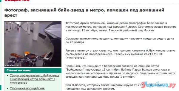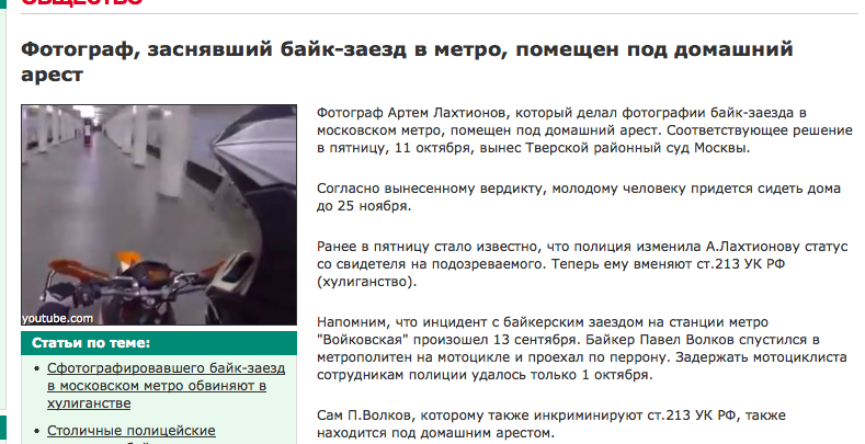 Все? Нет, очевидного манипулирования законом следствию маловато. Они хотят крови, хотя бы потому что шрамы на задницах наказанных за бездействия полицейских заживут еще не скоро. Максимальное наказание по первой части статьи "Хулиганство" составляет пять лет, и кое-кому этого кажется мало за поездку на мотоцикле. Именно поэтому к делу был привлечен Артем Лахтионов, фотограф, которому удалось запечатлеть мотоциклиста на станции. Следователи сделали его соучастником, а саму статью переквалифицировали на часть 2, до семи лет.