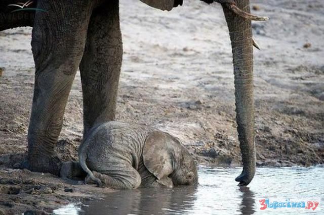 Маленькие слонята не сразу учатся пить воду при помощи хобота. Поначалу они утоляют жажду так