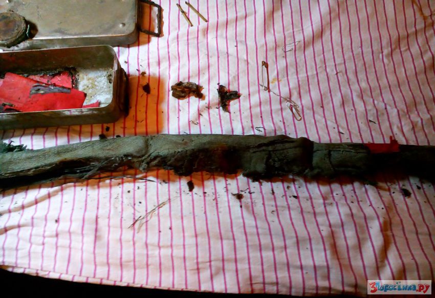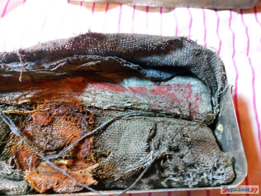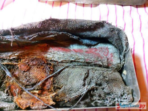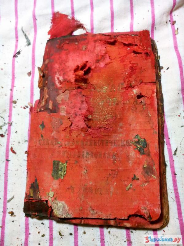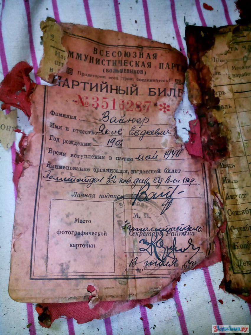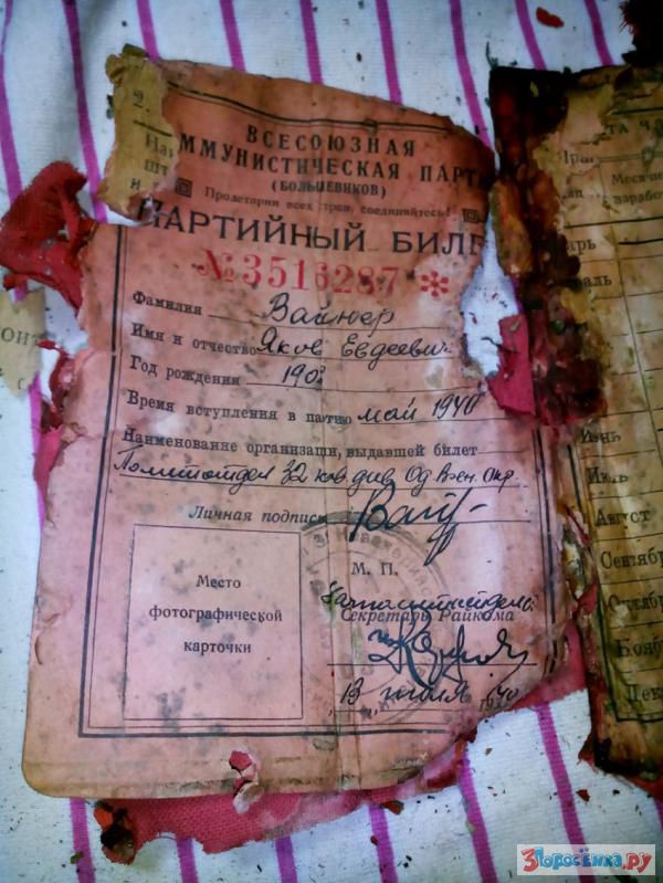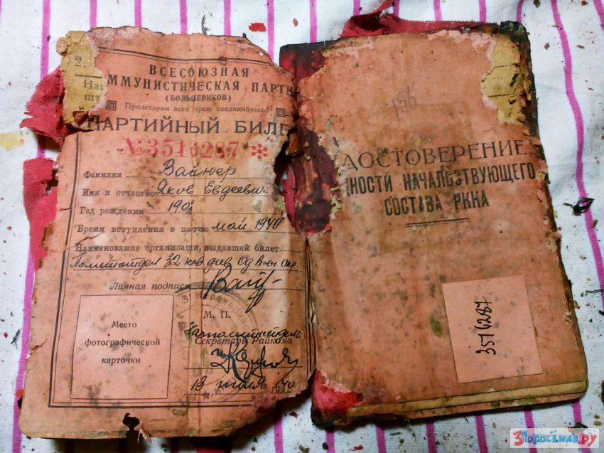 Как оказалось, деньги были тщательно зашиты в некий пояс из мешковины в четыре тугие скрутки. На дне же нас все-таки ждал небольшой сюрприз-бонус в виде... партбилета и удостоверения личности начальствующего состава РККА. Это, пожалуй, - наиболее ценная вещь, т.к. позволила идентифицировать собственника клада и даже время его закладки.
